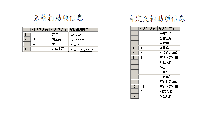 运行后,如下图二所示,可知在系统辅助项里,部门辅助信息编码为1,若辅助凭证明细表及辅助余额表中字段名为checktype1,则代表该列为“部门”辅助代码;在自定义辅助项里,药房辅助信息编码为8,若辅助凭证明细表及辅助余额表中字段名为zchecktype8,则代表该列存储的为“药房”辅助代码,以此类推。