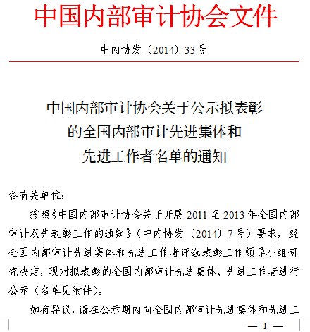 中国内部审计协会关于公示拟表彰的全国内部审计先进集体和先进工作者名单的通知