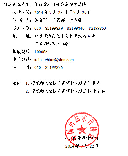 通知完整版请点击下载:中国内部审计协会关于公示拟表彰的全国内部审计先进集体和先进工作者名单的通知