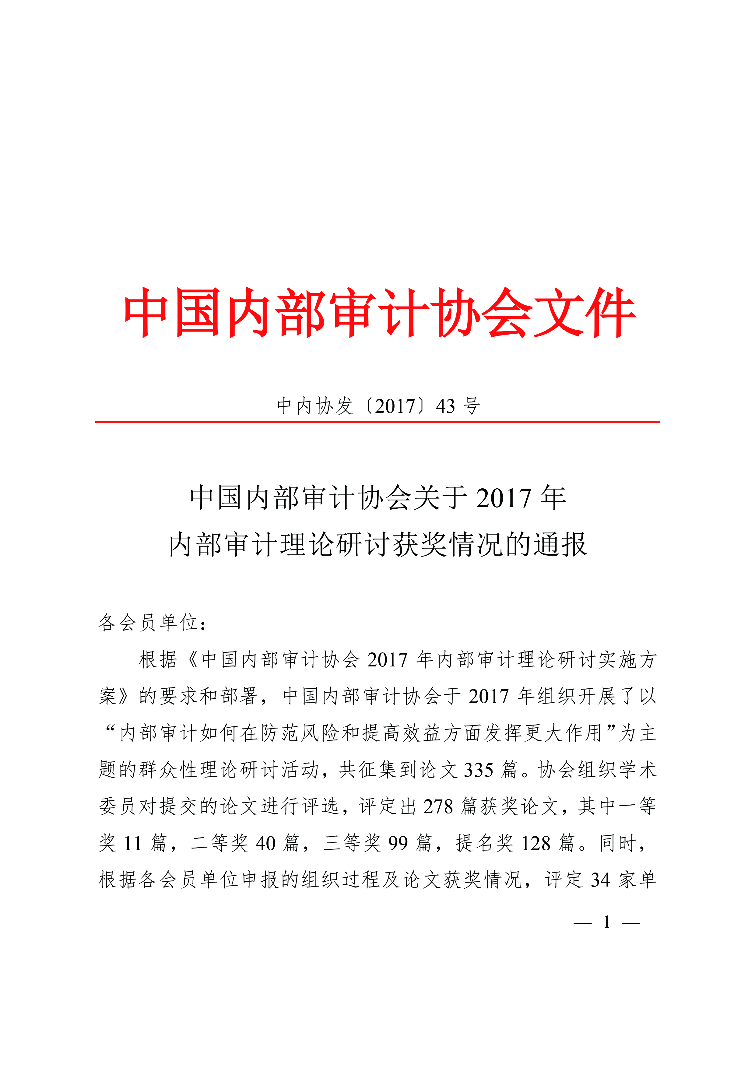 中国内部审计协会关于2017年内部审计理论研讨获奖情况的通报