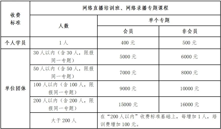 参加网络直播培训班和网络录播专题课程学习的学员,如系中内协单位会员或个人会员,或由各分会和省、自治区、直辖市、计划单列市内部审计(师)协会向中内协职业教育部报备的单位人员,或取得国际注册内部审计师(CIA)证书的人员,中内协将按“会员”标准收取培训费,其他人员或单位则按“非会员”标准收费。